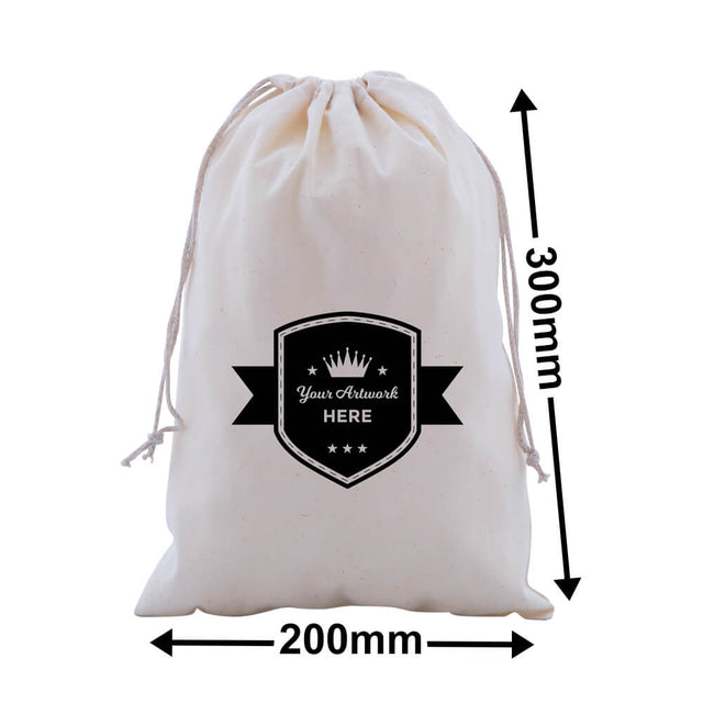 Custom Printed Calico Drawstring Bags 300x200mm 1 Colour 2 Sides