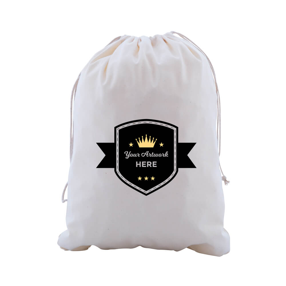 The bags measure 400mm x 300mm, and feature a drawstring mechanism and natural calico material. See our printing process in this one page explainer.