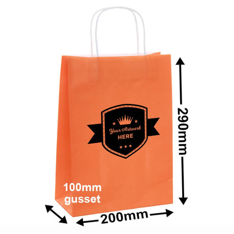 Minimum purchase of 500 bags is required.Custom Printed 350x260mm Coloured Paper Bags (8 Colours) 1 Colour 2 Sides