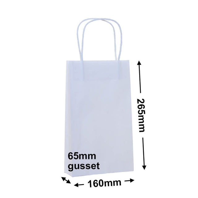 Extra small white paper carry bags have that clean fresh look. The bags have a comfortable handle and make carrying a breeze. These are great for those little items like lollies, jewellery, electronics and cards. Giftshops would find these bags invaluable. Birthday parties for small gifts is an awesome idea. Why not get the kids to be creative and put a design on the front of it.