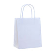 Mini white paper carry bags have that clean fresh look. The bags have a comfortable handle and make carrying a breeze. These are great for those little items like lollies, jewellery, electronics and cards. Giftshops would find these bags invaluable. Birthday parties for small gifts is an awesome idea. Why not get the kids to be creative and put a design on the front of it.